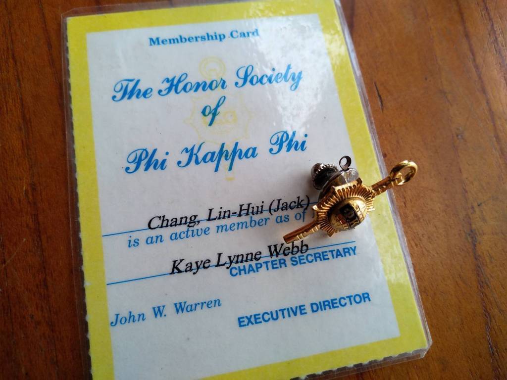 回到那枚金亮的領章,和英文卡片。這在台灣翻成「斐陶斐」,是一個以美國為主的榮譽學術社團。大學成績若在3.5+/4.0以上,而由系方代申請,應該也會得到此榮譽。我是在美國留學時,研究所成績滿分全A,GPA 4.0/4.0,而由研究院院長 (Dean) 頒發的。很難得有機會帶著它亮相,但也很容易吸睛,在美國時就曾遇到不認識的老美看了我一眼笑著說,他也有一個。