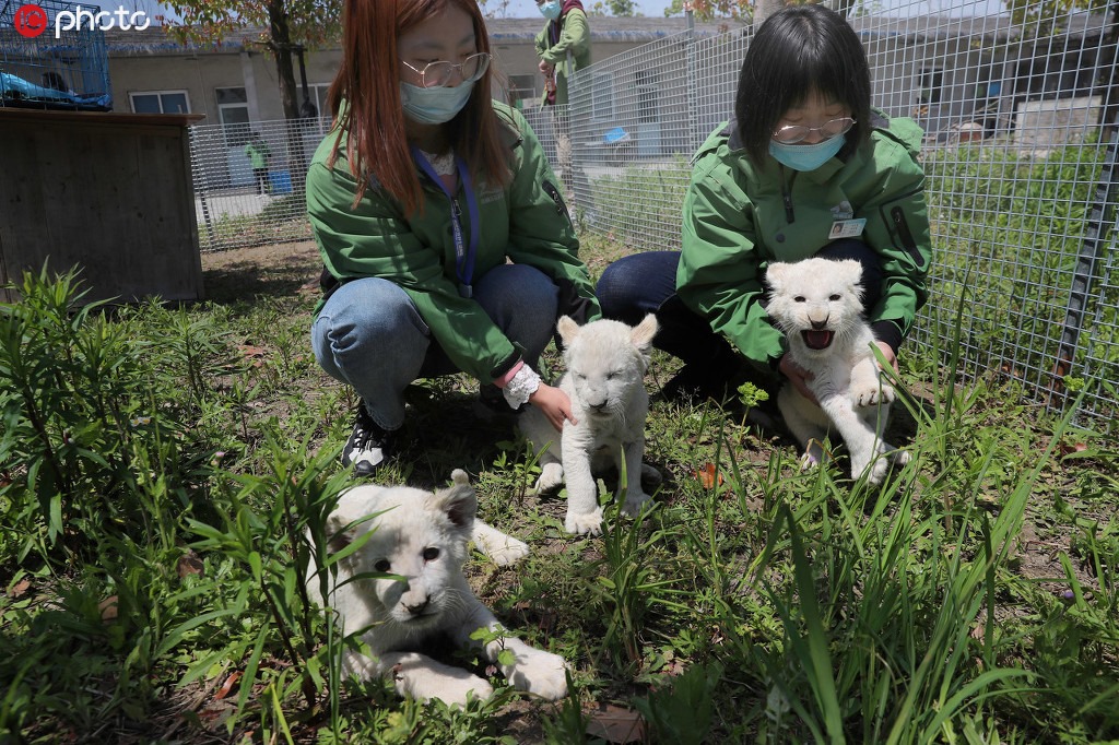 4月23日,出生近兩個月的罕見三胞胎小白獅在江蘇南通森林野生動物園亮相,將於五一假期正式和遊客見面。
