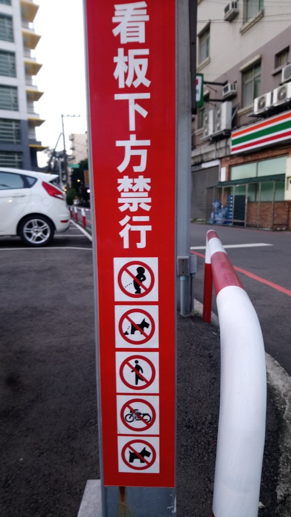 晨起安步當車往車站走去,因為晚上有飯局怕有喝酒,保險起見,連摩托車都不要騎了,就走路;路經一處四方形停車場,突然看見四隅之一角有個禁止立柱,標明「看板下方禁行…」字樣,下附5個禁止圖示。