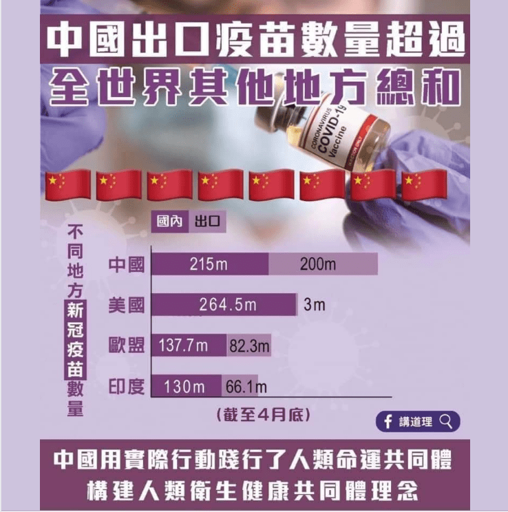在如此不利的環境下,很意外的統計發現,迄今為止中國出口的疫苗不但是世界第一名(截至2021年四月累積外國交貨2.0億劑),而且超過歐、美、印度所有國家出口的總和,其中的原因如下: