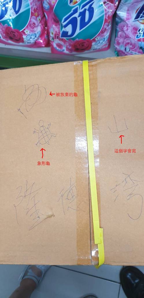 本以為是懷才不遇送貨大哥藝術家靈光乍現時信手留下的作品,一問之下才知道是因為送貨地點龜山的「龜」字太難寫,乾脆就直接畫隻烏龜,後面再加上個「山」字,也就是完整的意思表達了。