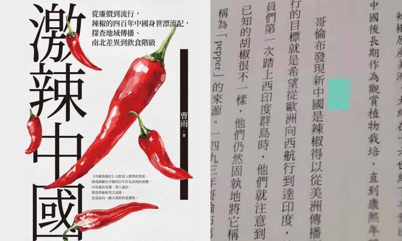 作者曹雨是人類學博士,2019年北京曾出版他的著作《中國食辣史:辣椒在中國的四百年》,書籍簡介說該書是「探討辣椒傳播的歷史路徑和食用辣椒的原因…」,可能較偏學術性,《激辣中國》是偏科普的通俗之作,在台灣出版應當也扯不上統戰陰謀的動機,沒想到卻因「哥倫布」與「新中國」而意外走紅!嗯,紅色也是多數辣椒的顏色。