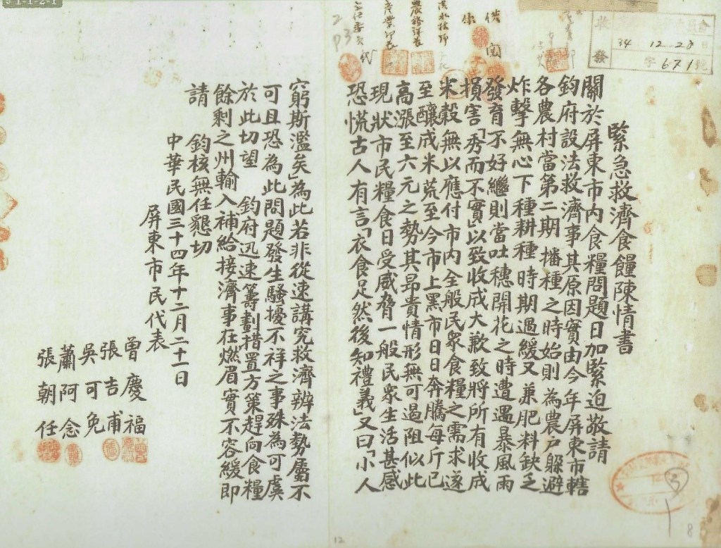 【日本投降之初、屏東民代表要求緊急救濟食糧的陳情書(註四)】