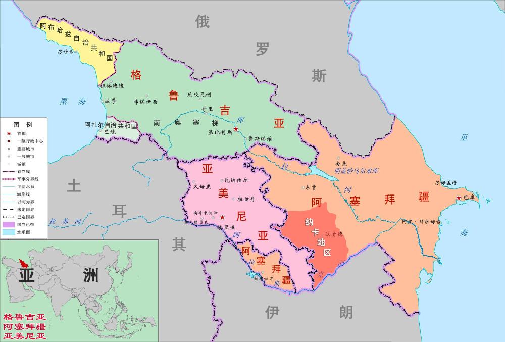 亞美尼亞與信仰伊斯蘭教的鄰國亞塞拜然之間存在納卡地區的領土爭議問題,雙方曾在1988-1994年間在邊境發生不少軍事衝突,並於2020年10月再次爆發激烈軍事對抗,對資源缺乏的小國亞美尼亞很不利。大致而言,亞美尼亞背後有俄羅斯的支持,而亞塞拜然背後有土耳其的支持,因此兩國的軍事衝突有代理人戰爭的影子。