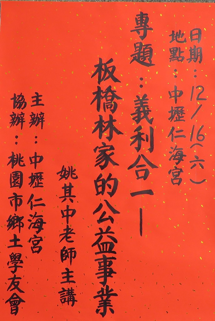 一個多月前剛閱讀過許雪姬教授所著的《板橋林家─林平侯父子傳》,對板橋林家遷台與發跡的經過有了比較有脈絡的了解。不想,桃園鄉土學友會便安排了姚其中老師的講座:「義利合一:板橋林家的公益事業」。