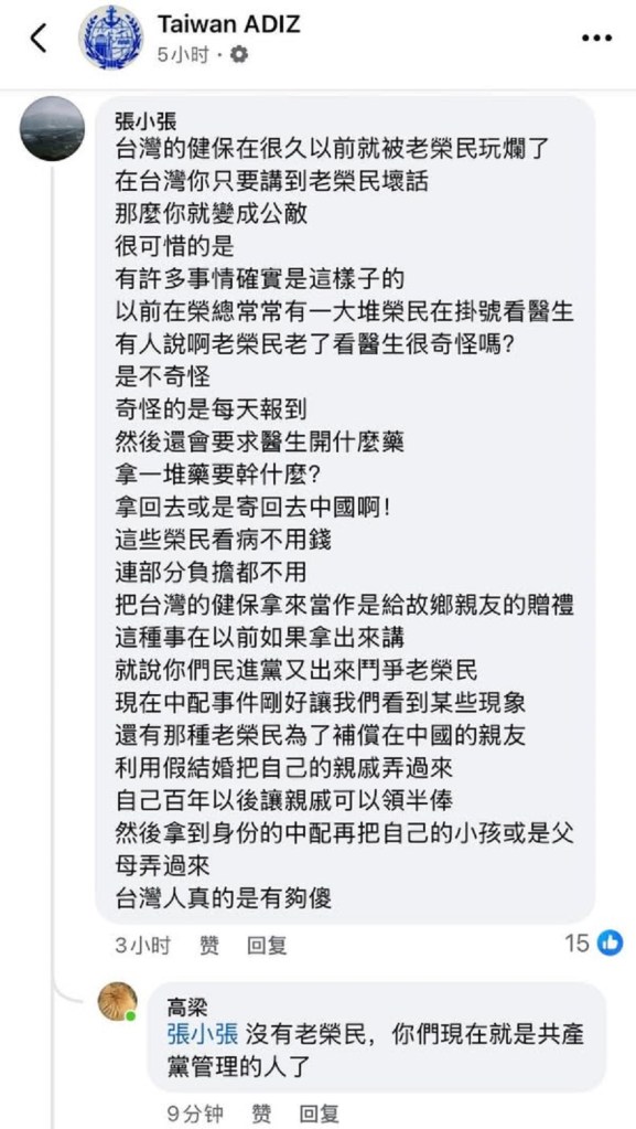 如下截圖,台灣竟然有網民,或許是綠營網軍,指控外省老兵在榮總領取免費的健保藥品寄給大陸的親人,把健保吃垮了。