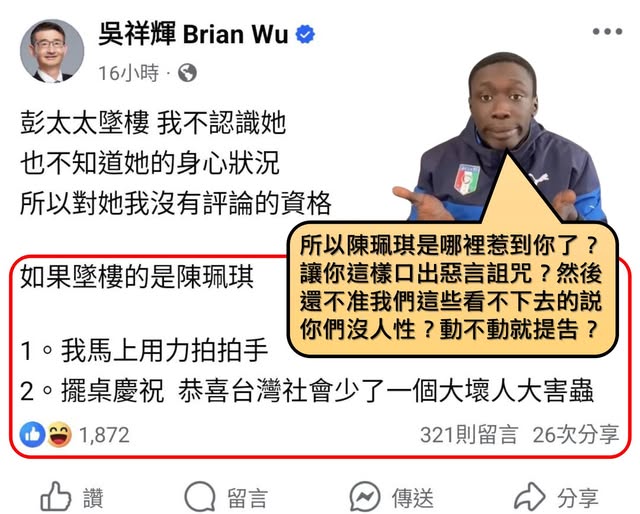 柯文哲的副市長彭振聲的妻子墜樓身亡,作家吳祥輝竟然PO文希望墜樓的是柯妻陳珮琪!陳珮琪是哪裡惹到你了?讓你這樣口出惡言詛咒?然後還不准我們這些看不下去的說你們沒人性?動不動就提告?看著看著就想起一件發生在2020年的往事?