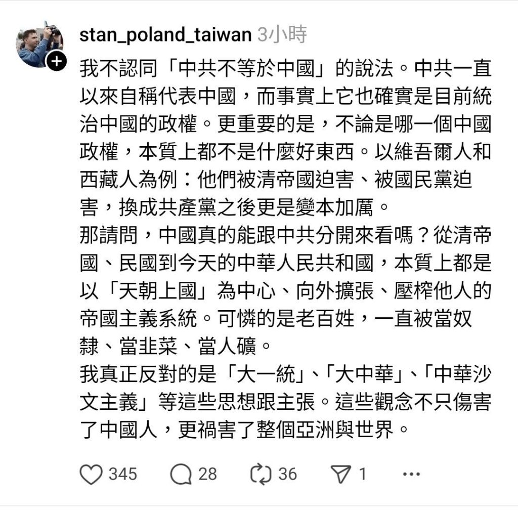 最近波蘭親綠網紅斯坦在Threads 說,中國自古以來的「天朝上國」,就是向外擴張、壓榨他人的帝國主義系統,內部人民一直當「韭菜」、「奴隸」、「人礦」,說「大一統」、「大中華」、「中華沙文主義」不只傷害了中國人,更禍害了整個亞洲與世界,例如維吾爾族和藏族受到的「迫害」。但他這種說法顯然不了解中國。