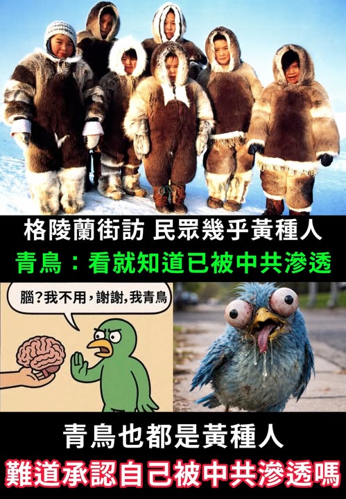 在格陵蘭街訪,民衆幾乎都像黃種人。青鳥說:看就知道已被中共滲透了。青鳥也都是黃種人,難道承認自己被中共滲透嗎?
