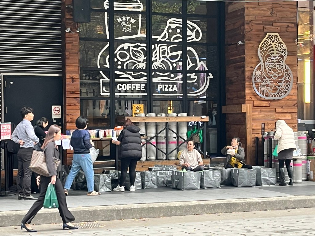 出我意料之外的是,我先看到三個國中年齡的男生圍在那個咖啡攤前面,顯然也要購買咖啡。他們離開以後,又有三個同年齡的女生也走了過來。其中的一個女孩先把一個很重的紙箱子擺在一隻空椅子上,然後協同另外兩個女生走向那個攤子,臉上還帶著一種心照不宣的微笑。