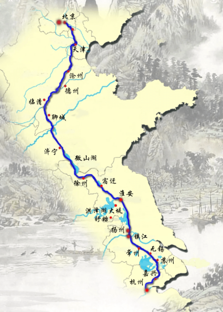 京杭大運河,又名中國大運河。南起杭州灣錢塘江,北行抵達北京市「萬壽寺」鄰近之「廣源閘」。流經浙江、江蘇、山東、河北、天津、北京等省市,溝通錢塘江、長江、淮河、黃河、海河五大水系,全長1794公里,2014年被聯合國列入世界文化遺產名錄。