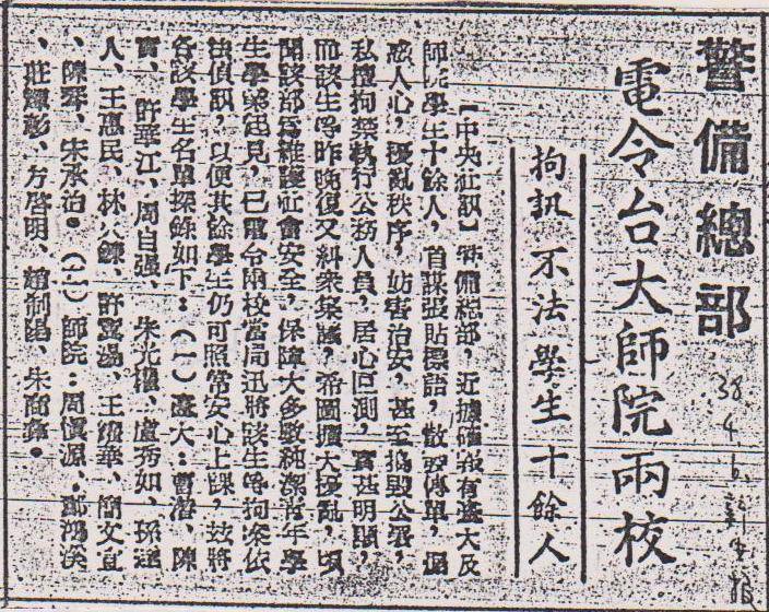 這時候,三月十六日應代理總統李宗仁電召到南京述職的臺灣省主席兼警備總司令陳誠返台。當他聽完下屬報告處理臺北學運的經過後,當場大發雷霆。面對大陸的頹勢,銜命整肅後方臺灣的他,於是下令清查「主謀份子」,準備抓人。一時之間,臺北的大學區便籠罩在白色恐怖的風暴即將吹來的威脅之下,風聲鶴唳,學生人人自危。