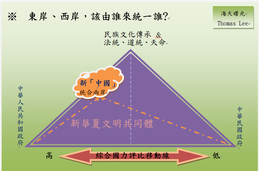 我看,從這次(2019年6月)香港「反送中」抗爭之後,大陸人民反對以「一國兩制」解決臺灣問題的聲量,恐會大幅攀升。結果,藍營因「獨台」夢醒,不想統一,綠營則因「台獨」夢碎,不願統一,藍、綠都想盡辦法拖延。但是愈拖對臺灣社會愈不利!因為兩岸綜合國力發展趨勢一升一降,時間對中國大陸有利,台灣所有優勢反倒因此迅速流失。(參考圖說:東岸、西岸,該由誰來統一誰?)
