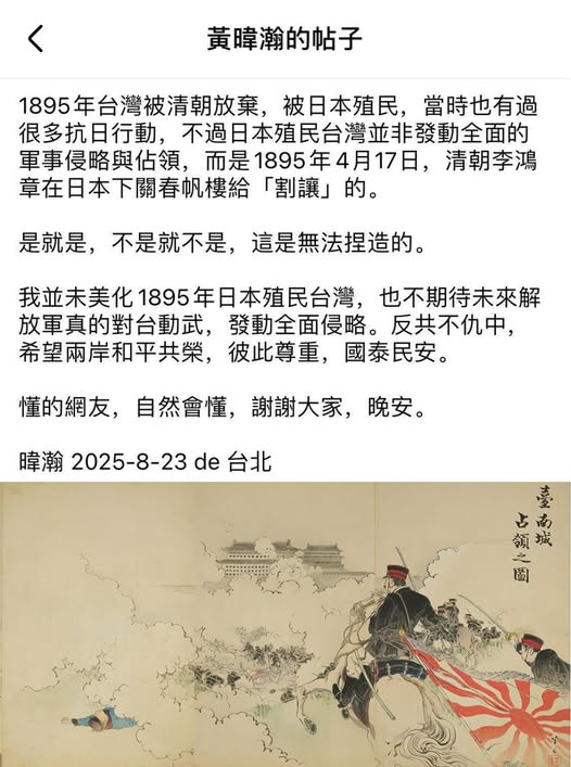 「割台之議,前往馬關爭執再四,迄不可回。倭欲得之意甚堅,既不許亦將力取。澎湖先已殘破,台防亦斷不可支。與其糜爛而仍不能守,不如棄地以全人,藉以解京師根本之危迫,兩者取輕,實出萬不得已。」