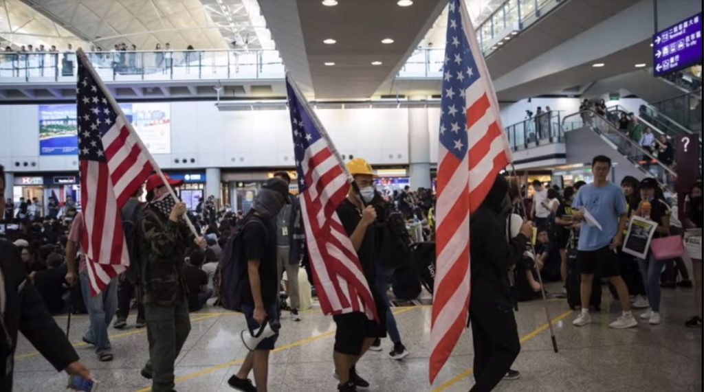 路上就看到許多頭戴防毒面具黑衣黑褲配備齊全的黑衣人手持長長鐵棍之類的工具,在一堆人打傘遮蓋的掩護下,破壞設施。