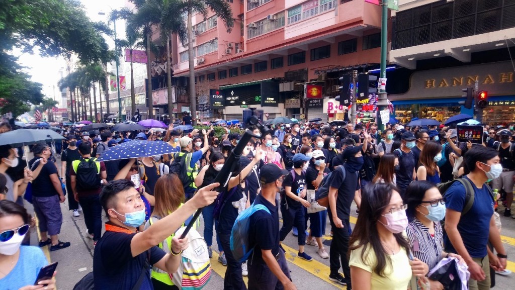 一走上彌敦道就發現滿滿的人潮在遊行,形形色色的人有老有少,多數是黑衣黑褲黑口罩,神情輕鬆自適,有點郊遊的感覺;一邊走著一邊有人帶著呼口號;有人高呼,眾人就跟著應和;不是很聽得懂,大概是光復香港之類的,還算平和。