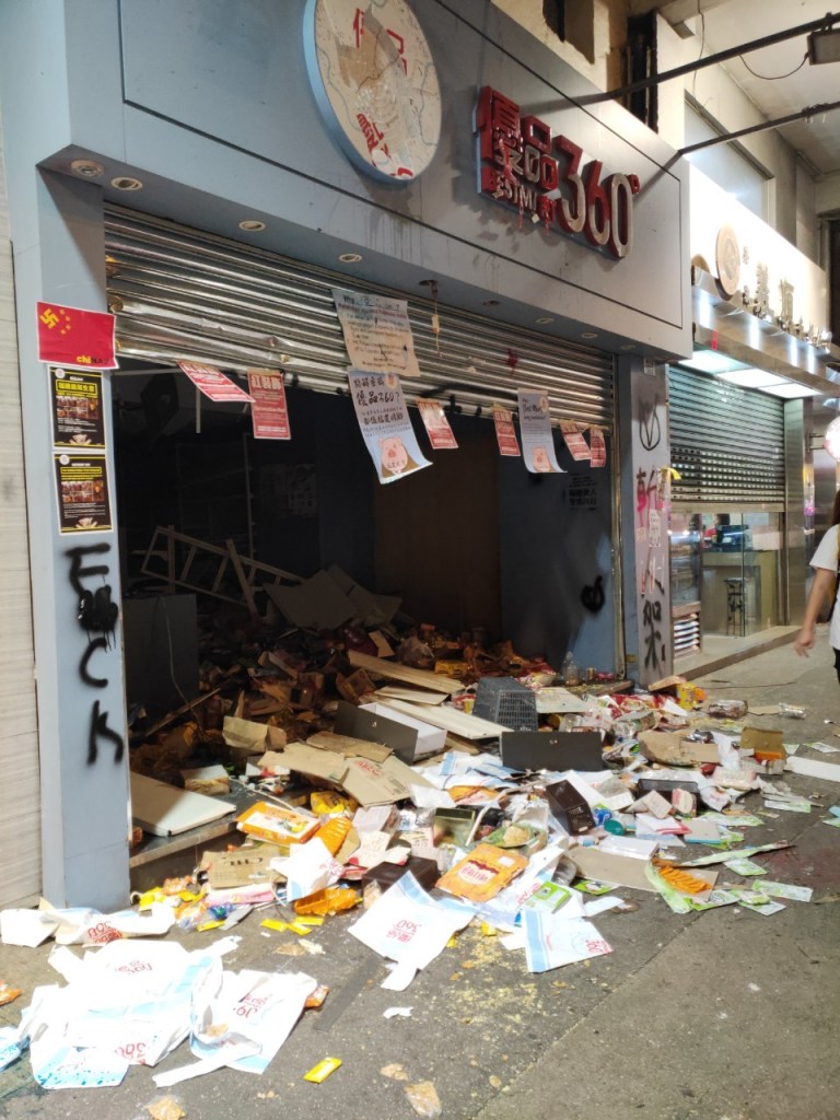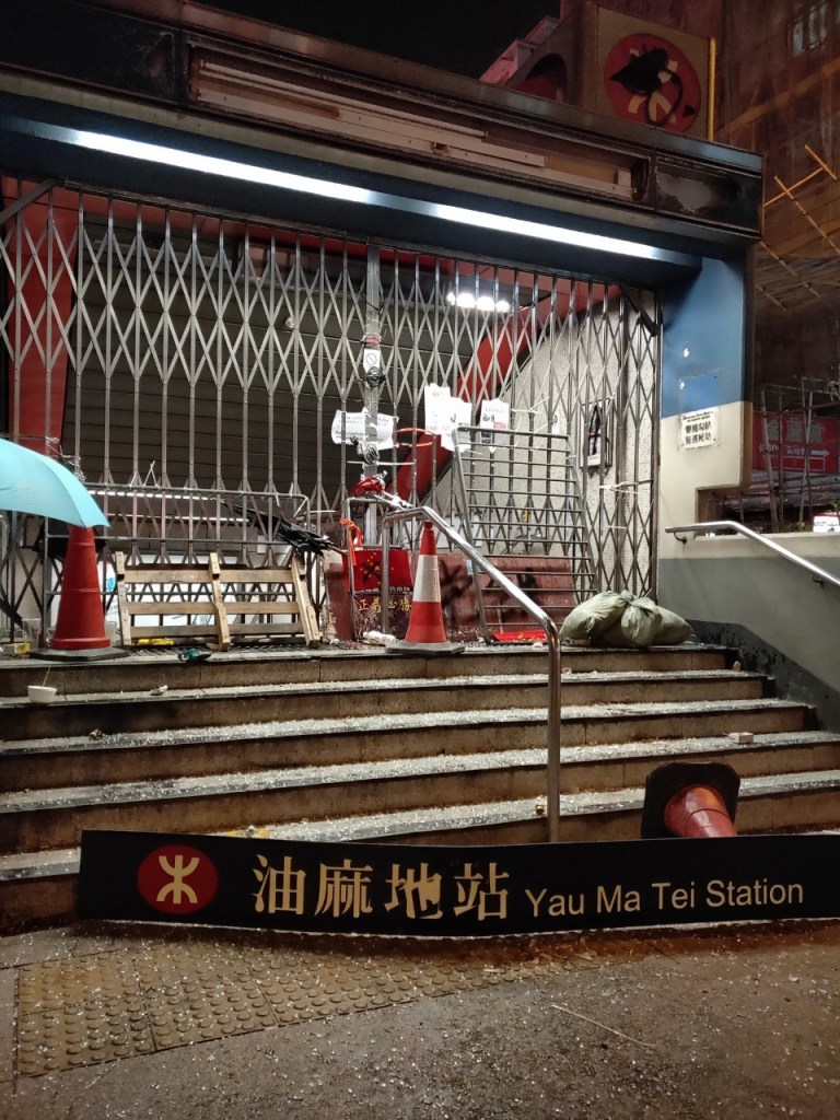 中國銀行鐵門被拆,路邊一間優品360已經門戶大開,所有貨物棄置一地,滿地狼藉,地鐵站入口即便鐵門都已經拉下,還是被破壞;標誌拆下,鐵門被反鎖上鎖頭,門口被縱火,牆上塗鴉,入口樓梯屋頂上還有黑衣人用榔頭連續擊打掛在上面的地鐵標誌,砰然作響傳得很遠,也不懼眾人圍觀。