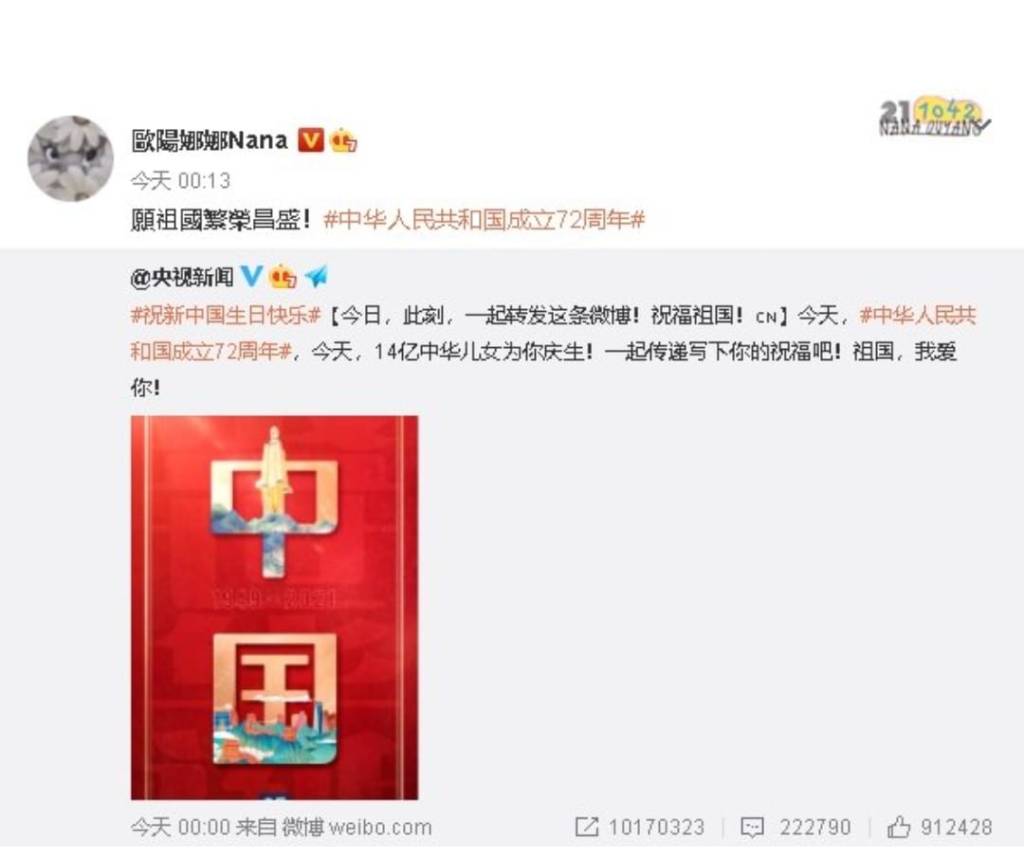 台灣出生的年輕女藝人歐陽娜娜,於十月一日凌晨在微博發文:「願祖國繁榮昌盛」!