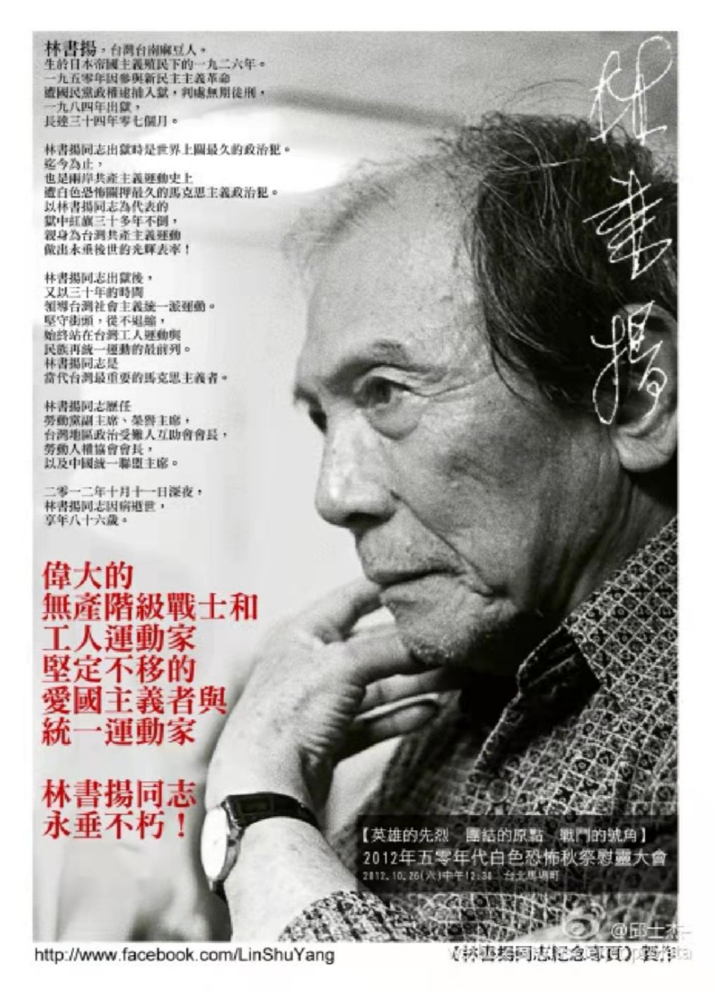 若說施明德堅貞不屈,不論在法庭上、監獄裡都矢志不移,這當然也是不容易且令人尊敬的。但同樣情況的人物還有很多,比如林書揚,思想左傾主張統一,同樣堅貞不屈,矢志不移,坐牢時間比施更久,艱苦備嚐;是不是亦應該同樣受到尊敬與褒揚呢?今厚施而薄林,這當然是現今的政治正確與社會上的意識形態所決定的。而這一現象本身,就顯得很不民主。如果施明德真心把民主更放在台獨之上,或亦會對此感到悲哀吧。