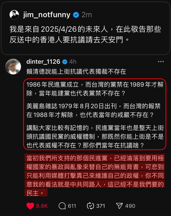 再以被我們視為自由民主典範的美國來講,當五十年代以蘇聯為首的共產勢力迅速擴張,國際風雲險惡,就發生了以麥卡錫參議員為首的政治迫害,那個時候只要是與共產黨有過來往,都可能被視為叛國,就連好萊塢的劇作家寫了社會性高,或說了蘇聯還不錯的劇本,也受到了政治迫害。這種情況過了幾年才有所矯正,但是假設蘇聯的擴張沒有受到遏止,赤化的地區擴大,甚至連拉丁美洲都布上蘇聯的核子飛彈,美國面臨國家安全的當頭威脅,這就不知道美國是否會矯正它的政治迫害,還是會變本加厲下去?